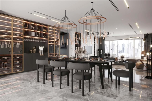 像这套客户样板房,以玄色为主基调,以玄色、灰色为主基调,玫瑰金作为对照色,整体室内的设计偏暗色,给人沉稳霸气、心坎安静舒适、平稳的体验感,而玄色、灰色又会给人一种高等感,最后经由过程玫瑰金强化视觉上的冲击和对照,勾画出无与伦比的尊贵和轻奢。