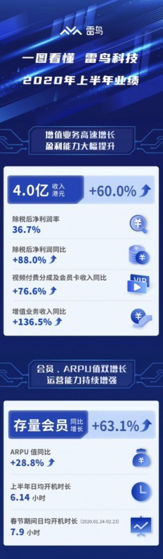 本年上半年疫情爆发,在旅游、餐饮、制作等线下行业陷进低迷的同时;OTT年夜屏、医疗健康、线上花费等 “宅经济”却逆势突起。勾正数据显示,春节时代国内智能电视日活率同比上涨15.6%,日均不雅看时长达6.33小时。作为智能电视行业的准独角兽,雷鸟科技上半年的营业收进、净利润、会员范围、开机时长等多项焦点指标均实现年夜幅上涨。据TCL电子(O1070.HK)中期事迹通知布告显示,旗下雷鸟科技上半年收进4.0亿港元,同比增加60.0%,此中会员营业收进和增值营业收进同比涨幅分辨达76.6%和136.5%;净利润达1.5亿港元,同比增加88.0%,净利润率高达36.7%。截至2020年6月,雷鸟科技存量会员同比增加63.1%,ARPU值同比上升28.8%,用户日均开机时长进步至6.14小时,此中春节时代用户日均开机时长高达7.9小时。