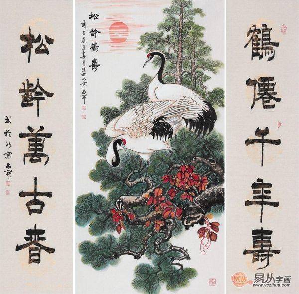 石开松鹤图书法春联《松龄龟年》作品起源:易从网