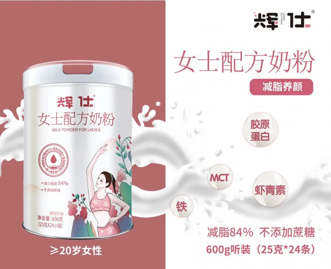 辉仕女士配方奶粉,减脂养颜,专门为20岁以上的女性朋友研发,减脂84%,加入MCT、雨生红球藻、维生素、铁、鱼胶原蛋白肽等多种营养物质,不仅有抗氧化、抗衰老的作用,更有塑身修型、补血养颜的功效,其中加入的MCT(中联三油甘脂),对人体的体重、腹部脂肪面积的减少,腰围的减少,均有明显的效果。