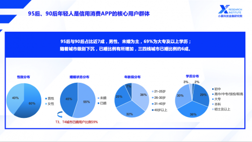 调研成果显示,信誉花费APP用户中男性占比60%,20-30岁用户占比近七成;年夜专及以上学历占到69%,该调研数据无疑彰显了信誉花费APP这部门用户的优质质量;同时陈述显示,未婚与已婚的比例分辨为55%、45%,且跟着城市级别下沉,已婚比例有所增添,三四线城市用户已婚比例近六成。
